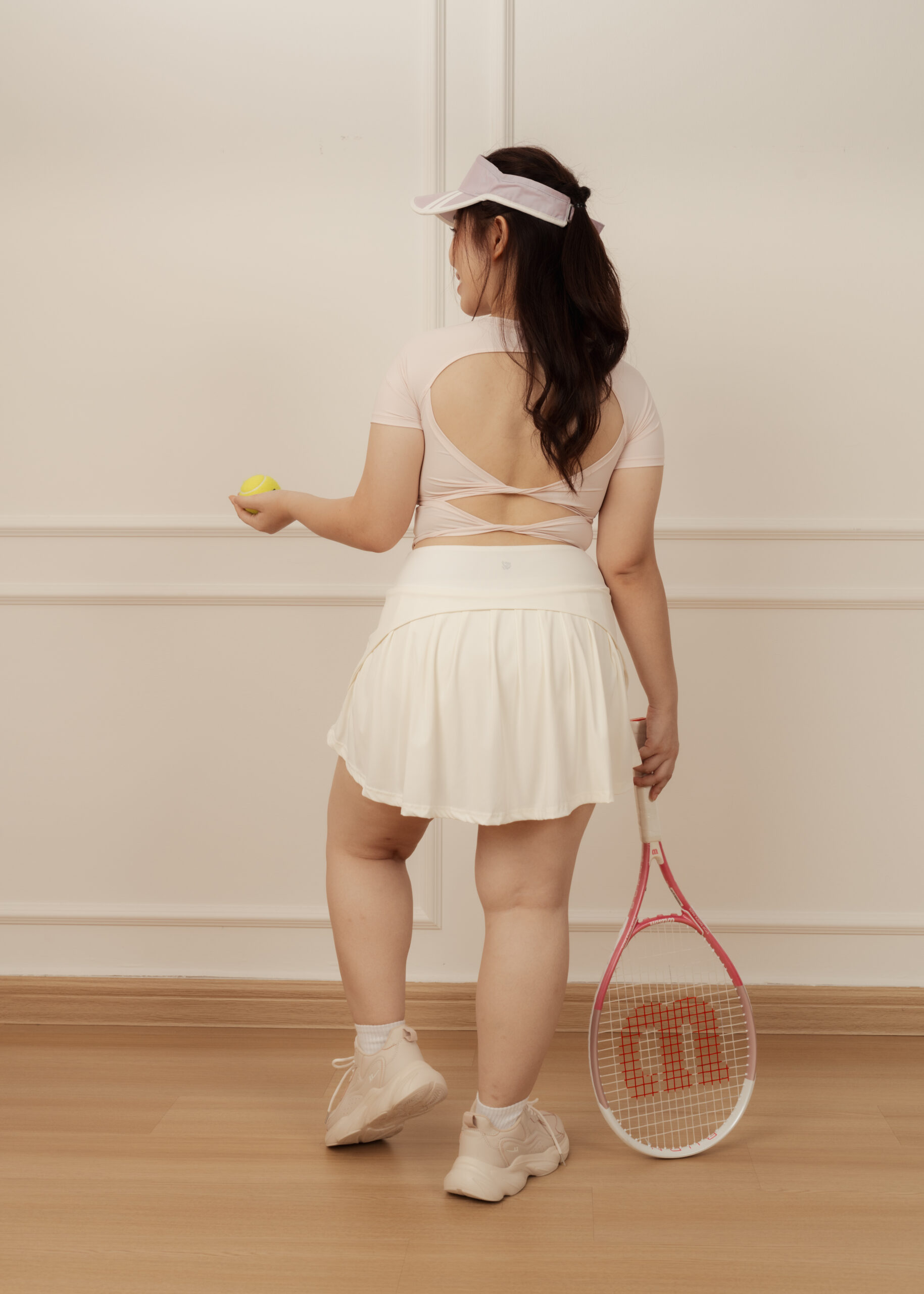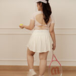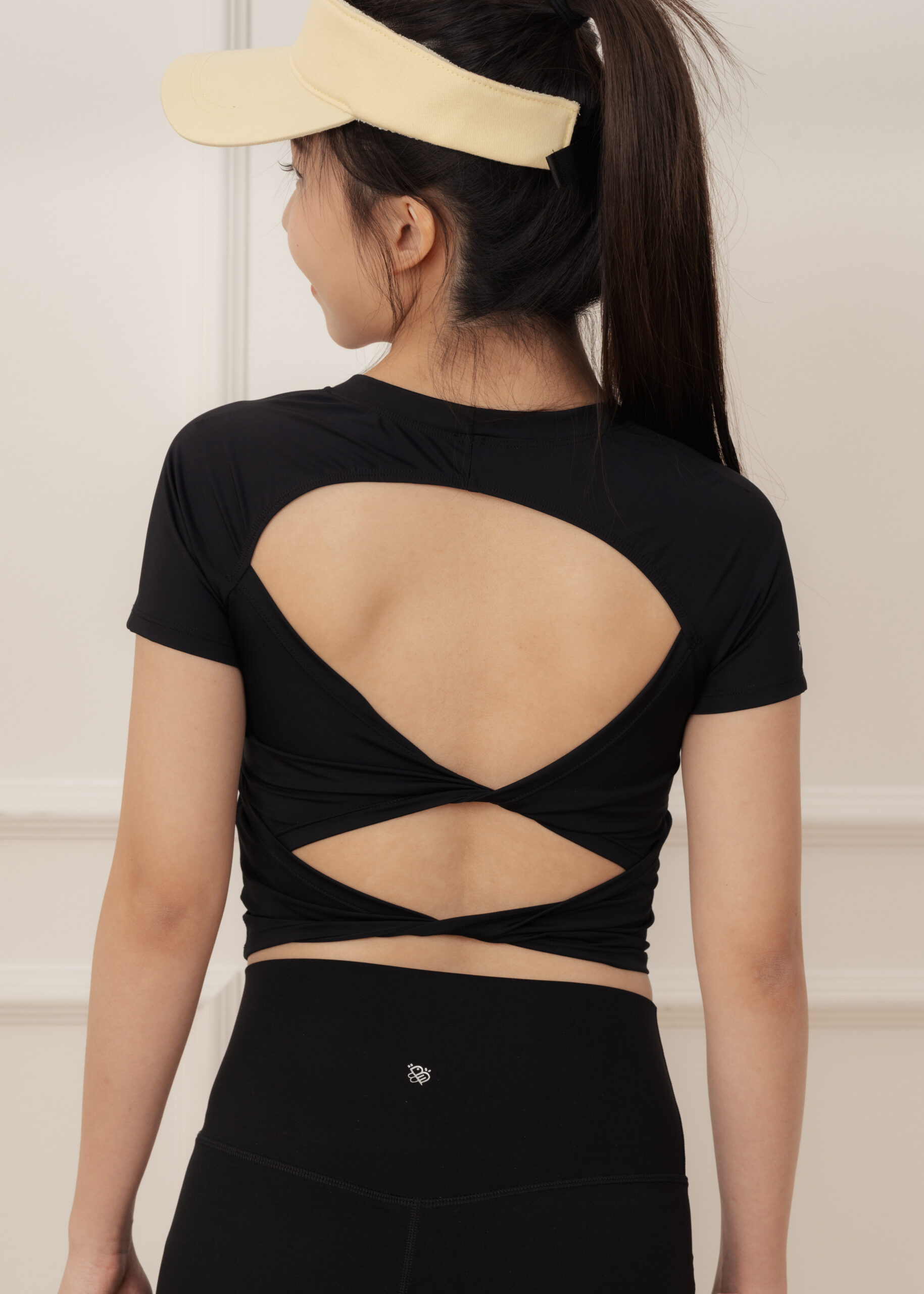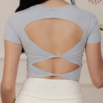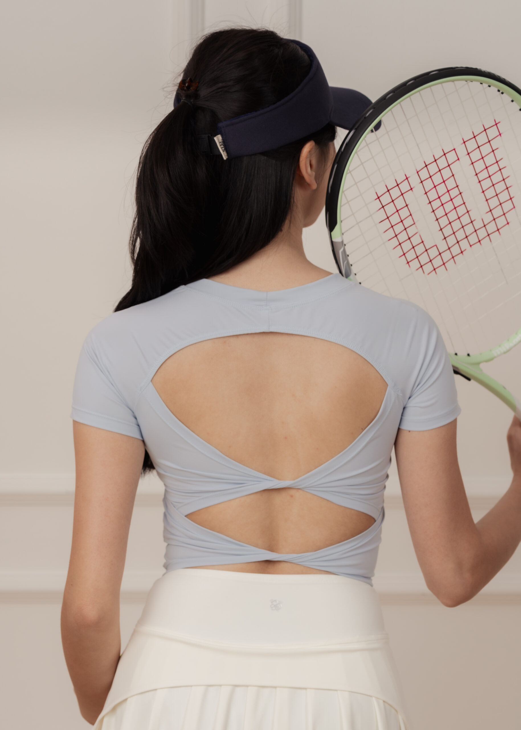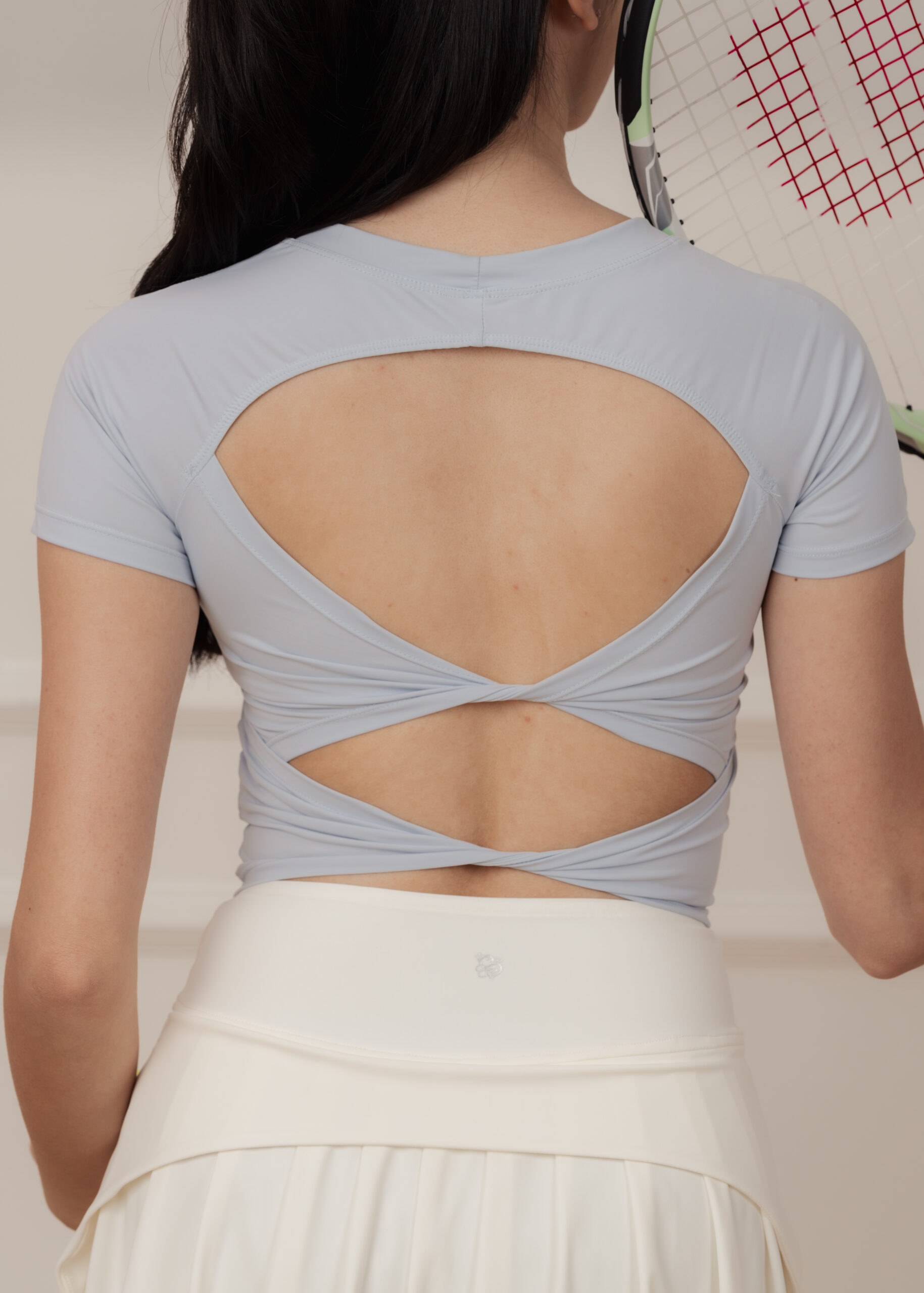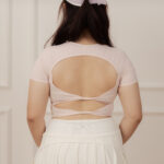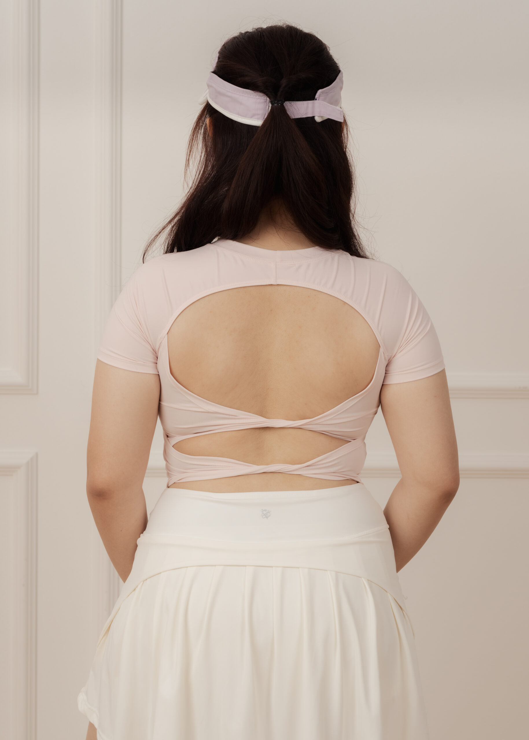 ダブルリボンのオープンバックが背中のシルエットを優美に整え、振り返りの瞬間を印象的に
